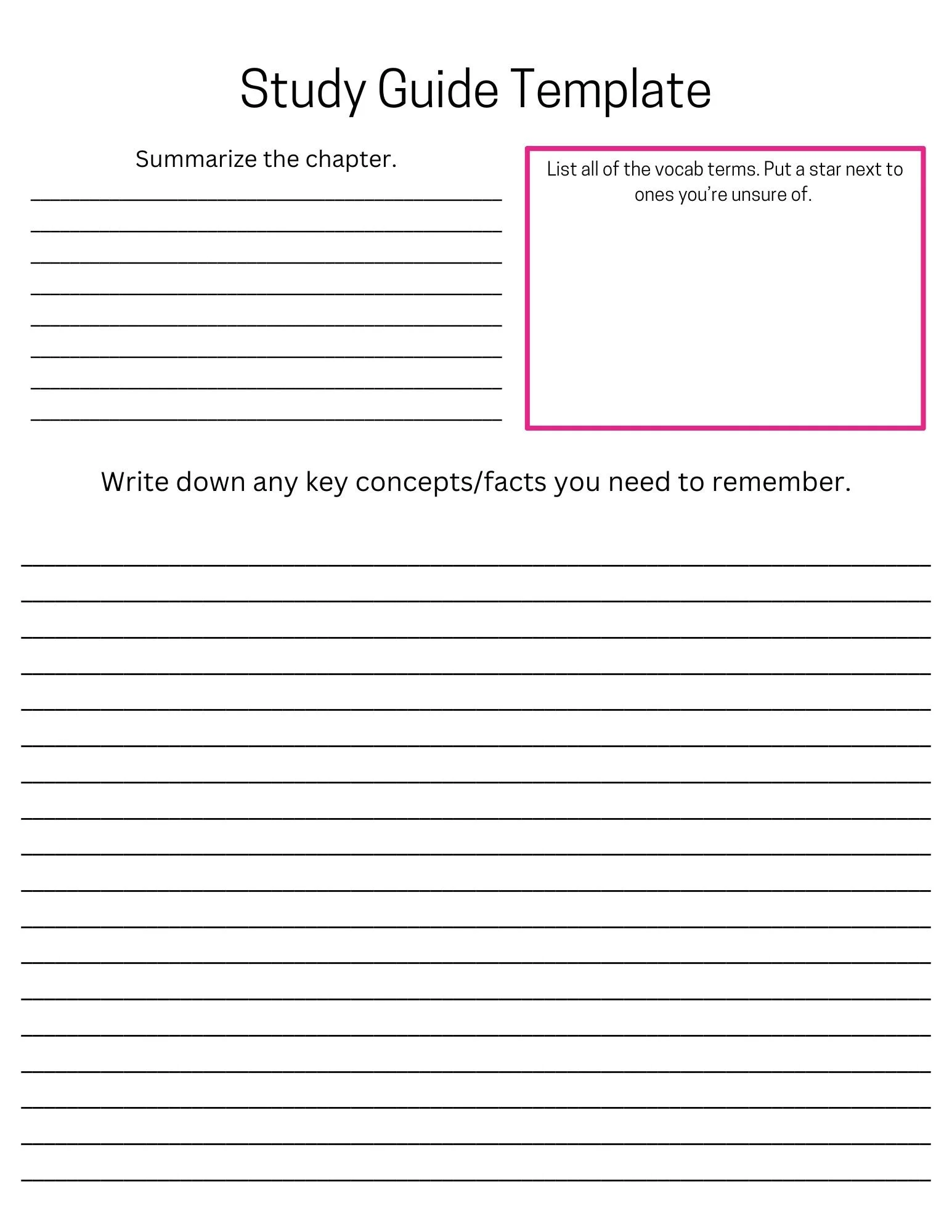 Free Study Guide Template. Either print and write on it directly or use it as inspiration for homemade study guides!